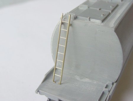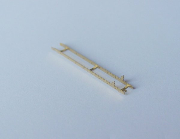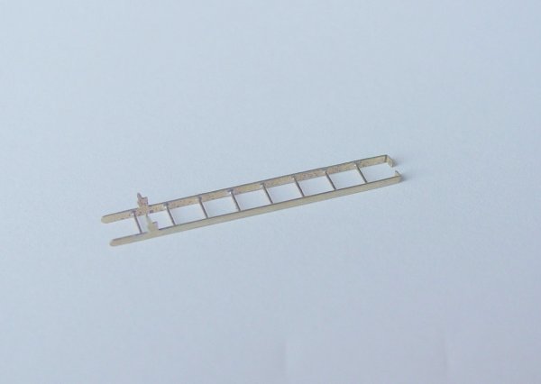 - The ladder can be folded (refer to 2nd photo at left) and then the rungs (0.3mm brass wire - not supplied) locted in the holes in the stiles and soldered together.