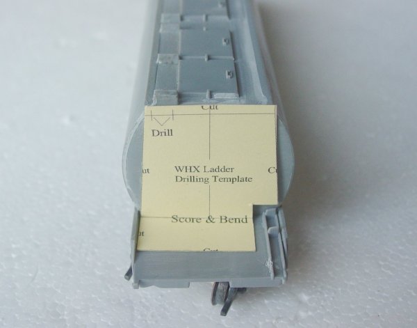 - Locate the cardboard drilling template on the bulkhead of the hopper . Notch out the template around the slack adjuster bracket (refer to the bottom photo at left). Hold the template in place and using a 0.4mmm drill, drill the locating holes in the positions shown on the template. Check that the ladder fits into the holes and open the holes out if the ladder is tight. The ladder can be placed in a secure place until it is ready to be assembled.