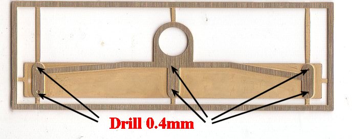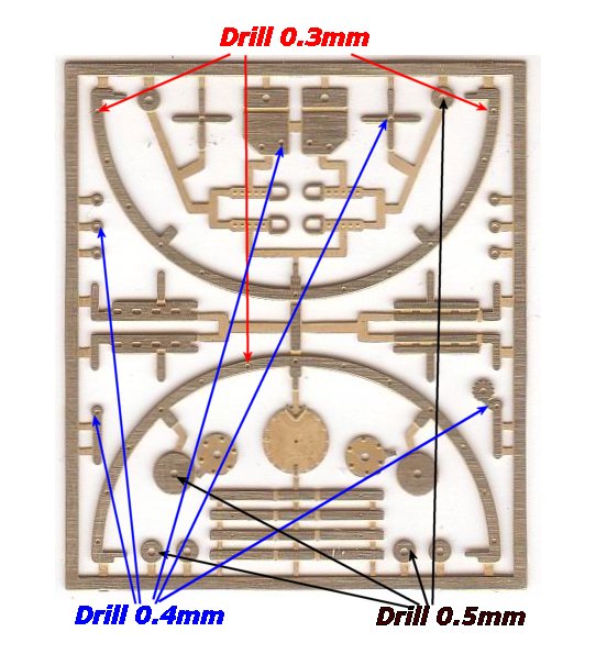 - Drill out the holes in the following parts using a 0.5mm drill. (B) Pipe Packing and (J) Tank End Pipe Plates. You can also drill out the top hole in (D) the Handbrake Brackets with the 0.5mm drill. (Refer to the photo at left)
