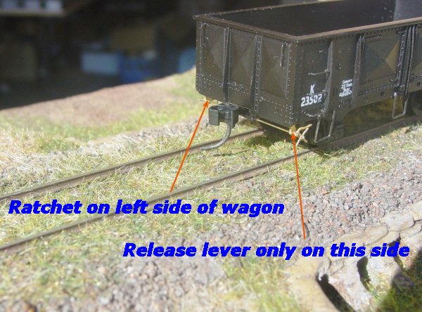 1. The brake lever with ratchet is located on the left side of the wagon when looking at the end of the vehicle. (refer to photo at left)