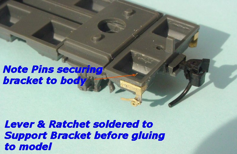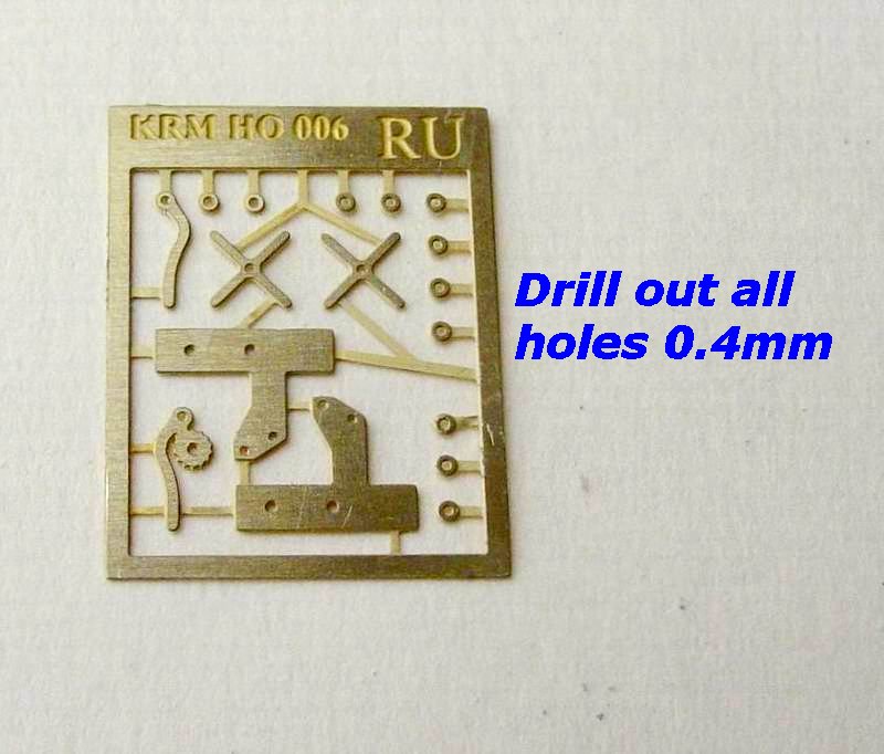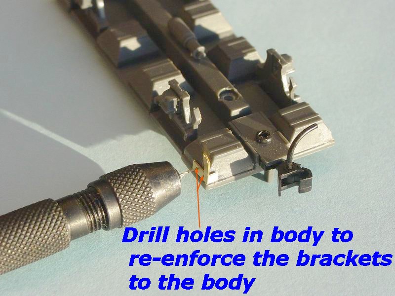 - You can re-enforce the brackets by drilling out the holes in the brackets using a 0.4mm drill, and fitting and glueing 0.4mm brass wire in the holes of the body.(refer to bottom photo at left) This process is optional