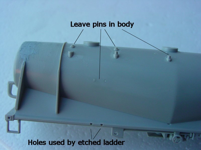 - Glue the remains of any pins left in the body with MEK (dangerous material, please only use in a well ventilated area) from inside and outside the body. Remove any walkway mouldings from the original body, and fill any holes not already filled with plastic pins. Remember to leave the bottom ladder holes as they are used to locate the new ladder. (Refer to 2nd photo at left)