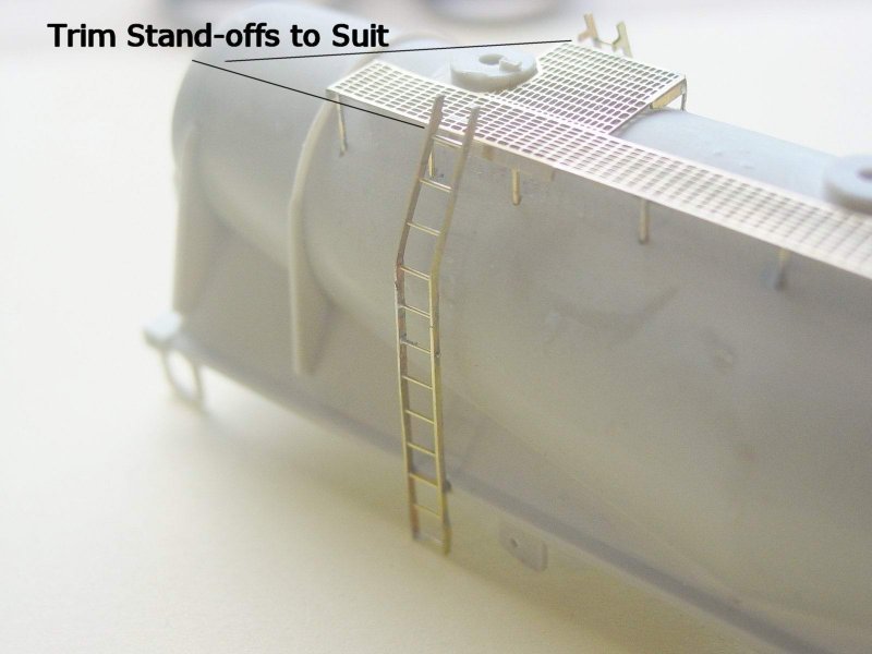 - The top pins on the ladders can be trimmed to fit, and the ladders can also be subtly bent at the kink in the stiles to assist in locating them against the walkway. The ladder opposite the landing side, can have the pins removed completely, (Refer to 5th photo at left) and the landing ladder (Refer to bottom photo at left) will need the pins trimmed down.