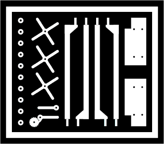 - Remove the spider wheels, and the levers & ratchet from the fret, and clean away any trtace of the tabs (there are a spare set of levers/ratchet and a spare brake spider for PING value) (Refer to 2nd photo at left). Hold the jig in position and drill the holes as shown. Continue to do all 4 corner positions.