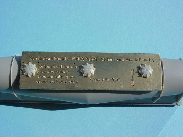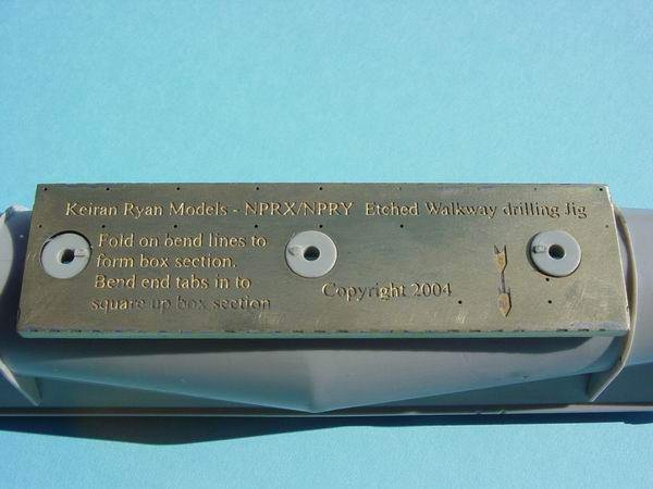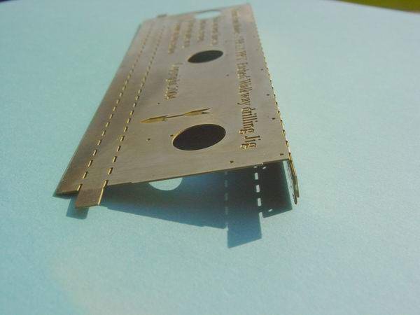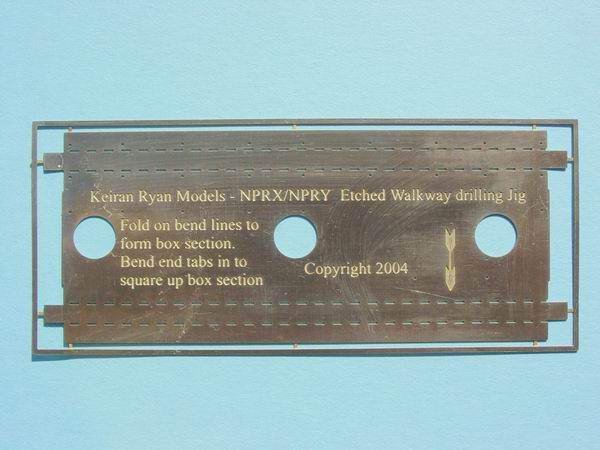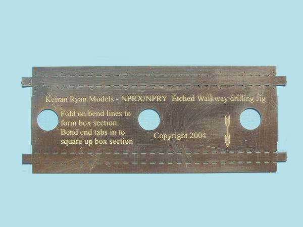 - The reason for the box section was to enable the jig to guide, firstly the pin and secondly the drill that drills the holes in the body to accept the walkway etch. To assist in the process, a brass lace pin is supplied in the kit and is used to act as a centre punch to give the drill something to bite into, and preventing it from wandering.(Refer to top photo at left)