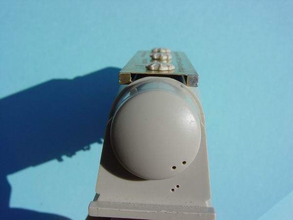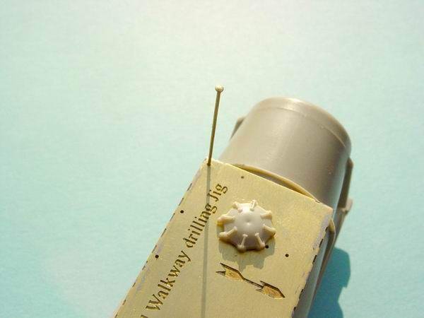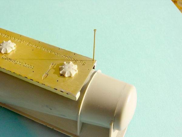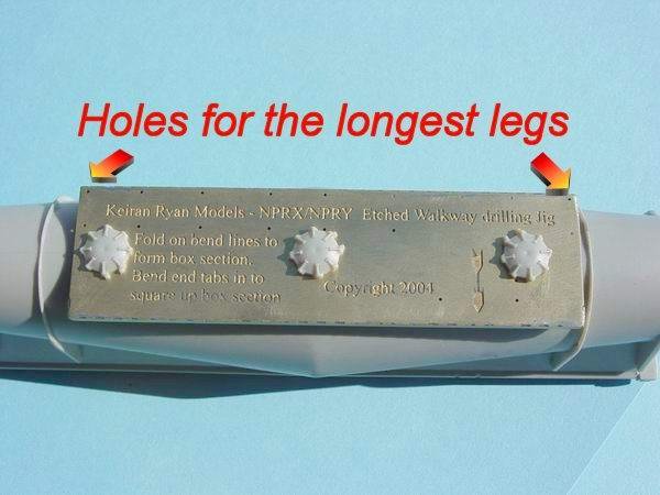 - Keep the jig on the model, and using a 0.5mm drill, locate the drill onto the marks previously provided by the pin. For now just mark the start of the holes. When all the holes have been marked, you can continue to drill through the body whilst keeping the drill square to the body. All of the holes are drill completely through the body except for the two end holes that are indicated.(Refer to bottom photo at left) The jig can now be removed from the body. HINT--- If you find it difficult to fit the legs of the walkway into the body you can drill the holes out using a 0.55mm or 0.6mm drill