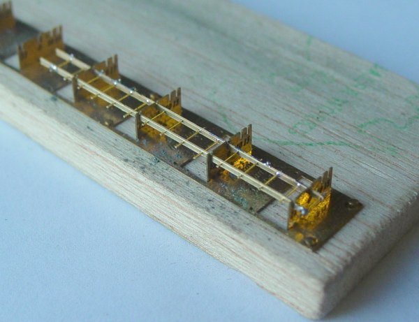 - Place 0.3mm wire into the ladder rungs and solder into place (do one side first). I prefer to use Carr's 188 solder paint. Simply place a dab of paint on the end of the rungs and heat with the soldering iron. The solder paint flows so that the joint forms through capillary action. (Refer to 3rd photo at left)