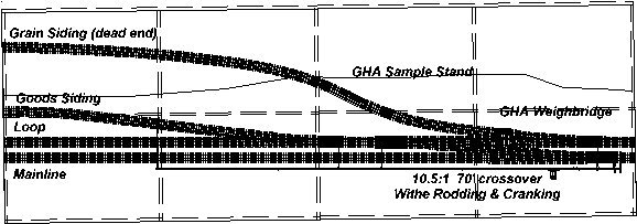 This module's main feature is the track work. Firstly the 10.5: 1 77' long crossover built to fine scale, the other turnouts are 8.25:1 70' and are also built to finescale. The pointwork is complemented with the total Rodding & Cranking that was in the yard at the time. Drainage is also a high priority and that is depicted in the model. Also located in this module are the (Grain Handling Authority ) GHA Sample Stand & Weighbridge.